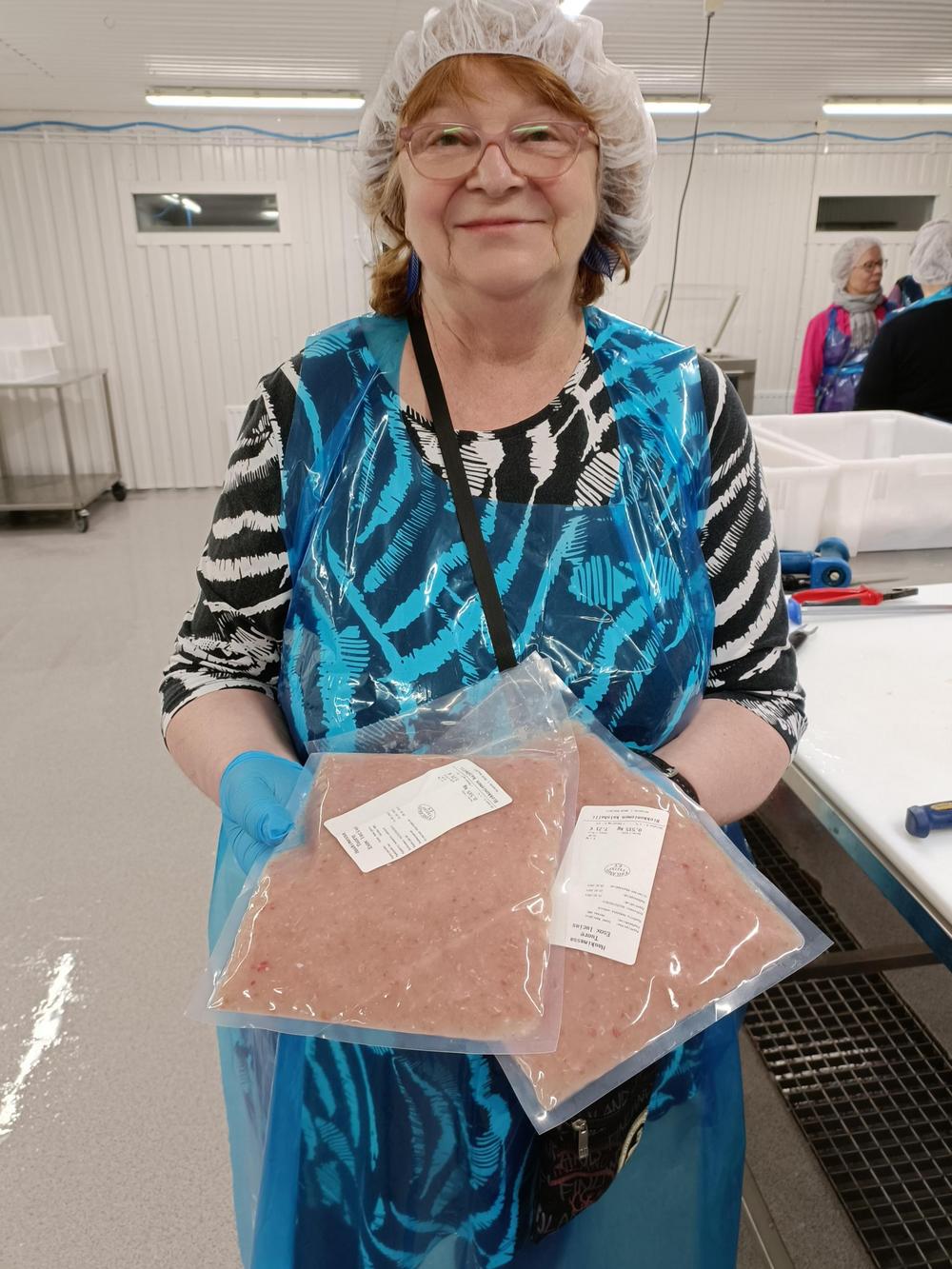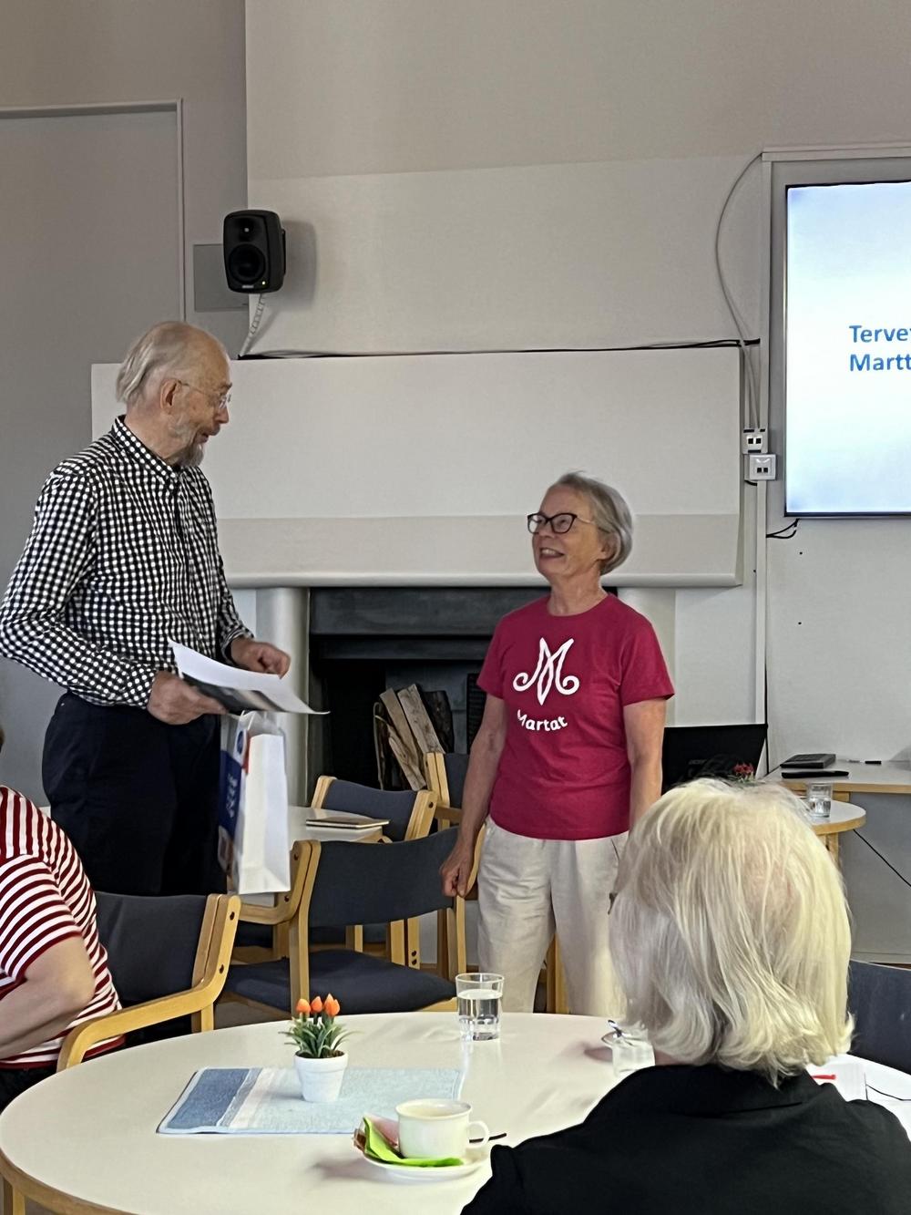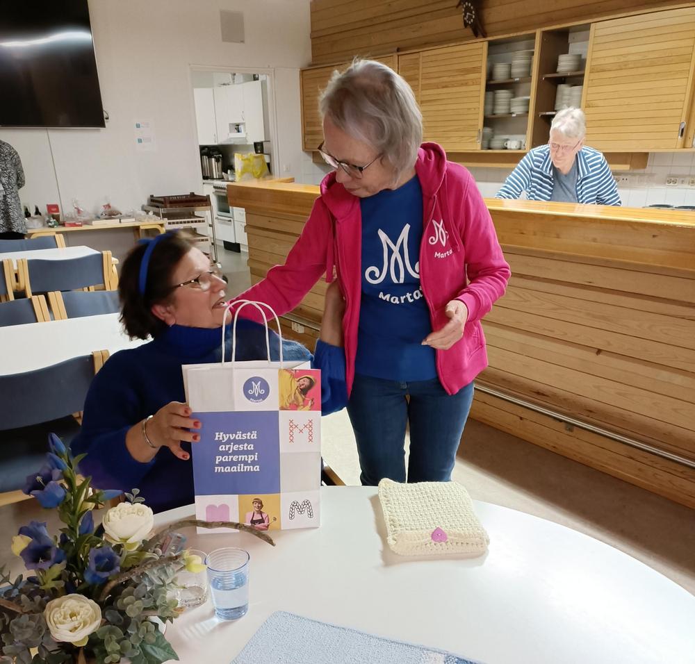 Kuvassa pj Riitta ojentaa Marttojen lahjan ruokapalvelupäällikkö Outi Majavalle.
