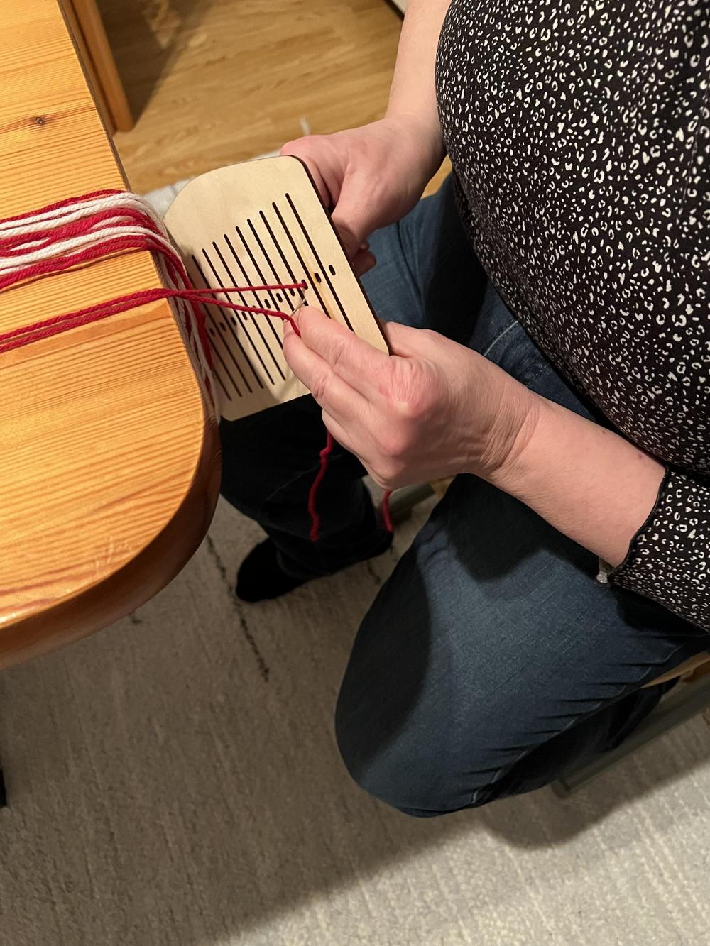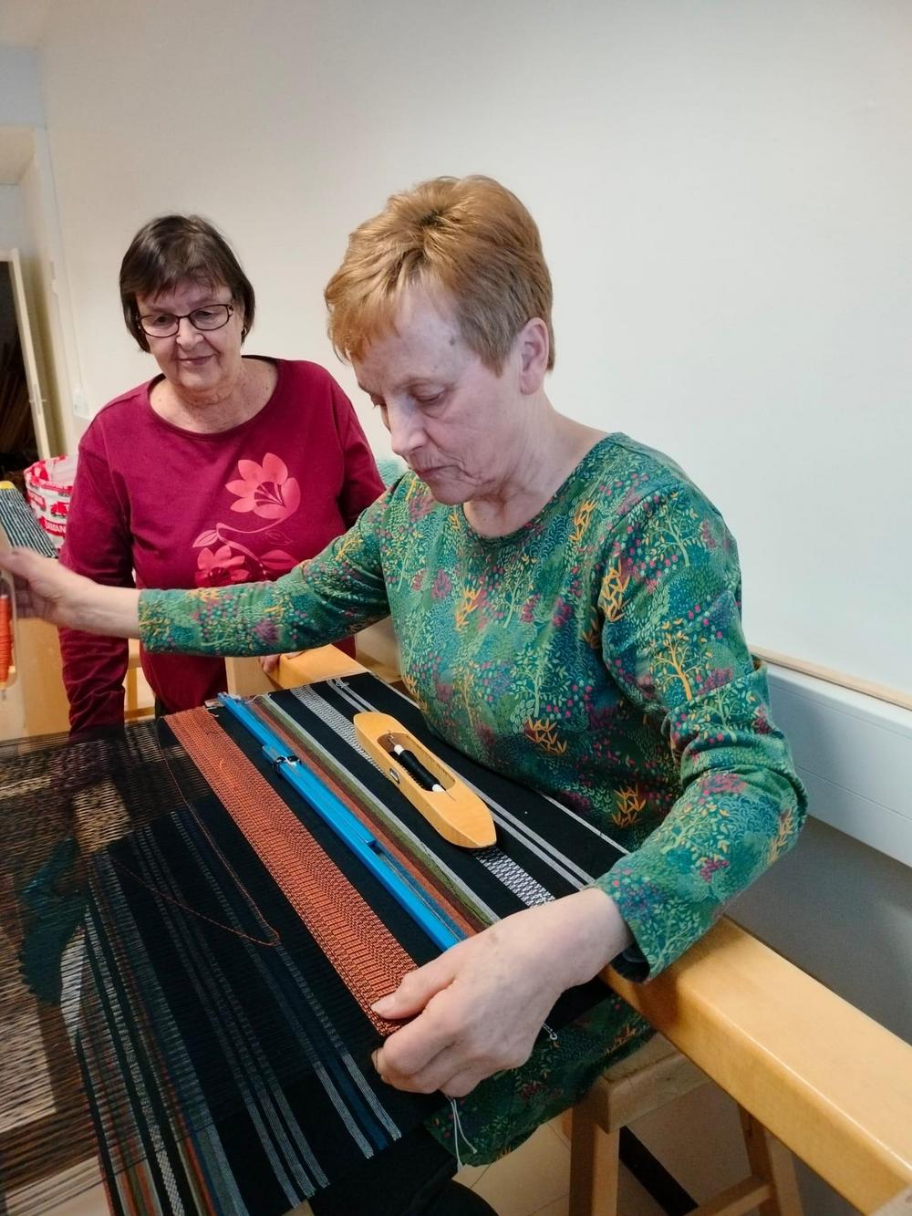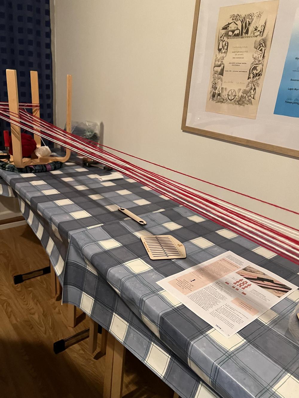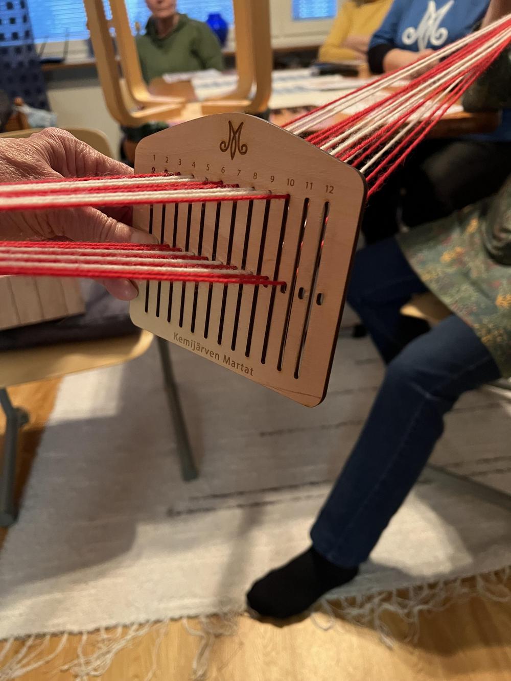 Kässämarttamme SJ opasti pirtanauhojen tekoon. Runsaan naurun säestyksellä saimme aikaiseksi muutaman loimen ja töitä myös aloitettiin. Kotona jatketaan!