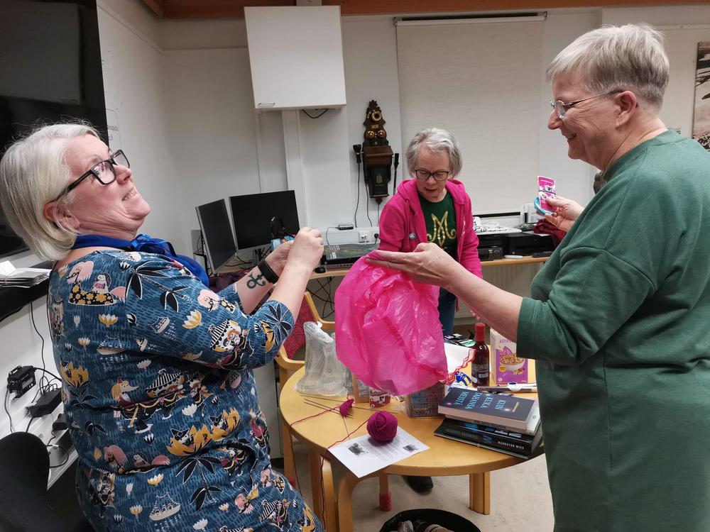 Vastasimme Pelastakaa Lapset -yhdistyksen pyyntöön kutoa kemijärveläisille eskarilapsille sukkia. Kirjastoon tuli 17 kutomaan, kahvittelemaan tai muuten vain juttelemaan. Sukkiakin tuli yli 30 paria. Toinen samanlainen tilaisuus oli 6.2. Sukkia tuli yli 100 paria!