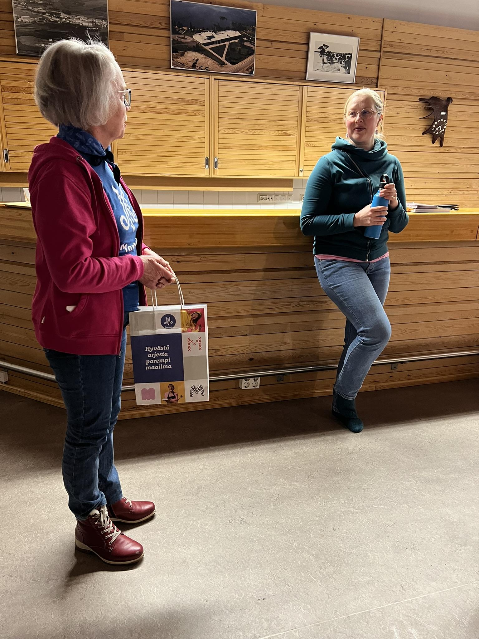 Kuvassa pj Riitta ojentaa Marttojen lahjan ruokapalvelupäällikkö Outi Majavalle.